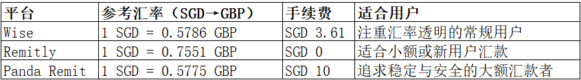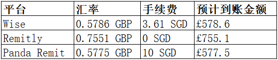 以下表格比较了几款常见汇款平台(以汇 1,000 新币为例):