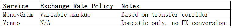 MoneyGram applies markups on international transfers. Venmo does not perform currency exchange as it is U.S.-domestic.