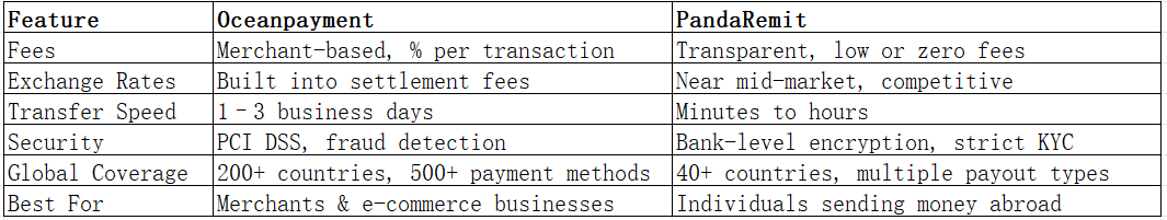 In comparing Oceanpayment vs PandaRemit, Oceanpayment excels as a B2B global payment gateway, while PandaRemit offers a personal-focused, low-cost remittance service. For businesses, Oceanpayment provides extensive merchant support, but for individuals wanting to send money home securely and affordably, PandaRemit is the more practical choice.