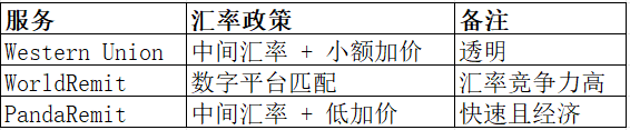 PandaRemit 的费用通常低于Western Union和WorldRemit,尤其适合小额或频繁汇款用户。