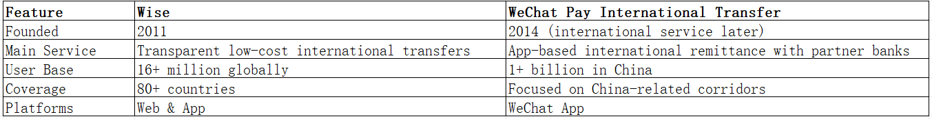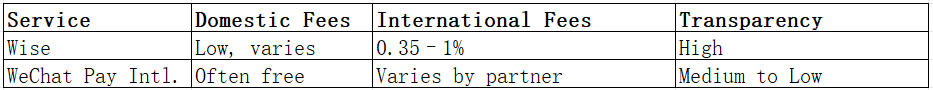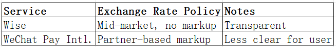 Differences: Wise prioritizes transparent fees and mid-market exchange rates, whereas WeChat Pay focuses on ease for Chinese users, sometimes at the expense of global flexibility.