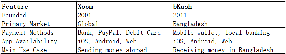 Xoom has a global focus and supports sending to many countries, while bKash is primarily used for receiving remittances into Bangladesh.