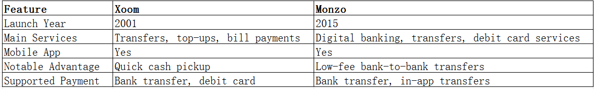 Fees: Xoom may charge higher fees for smaller transfers; Monzo focuses on competitive rates for bank-to-bank transfers