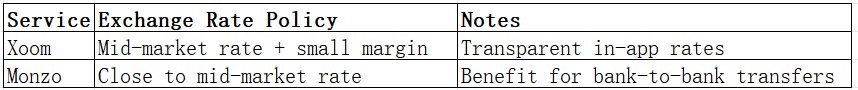 Xoom applies a small markup on mid-market rates, while Monzo provides near mid-market rates, particularly for premium users.