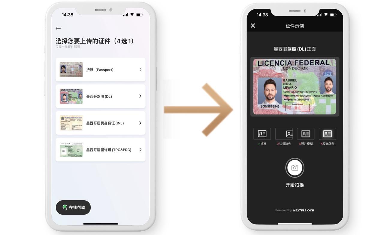 此处以墨西哥驾照为例,注意必须拍摄原件,否则会影响审核进度!
