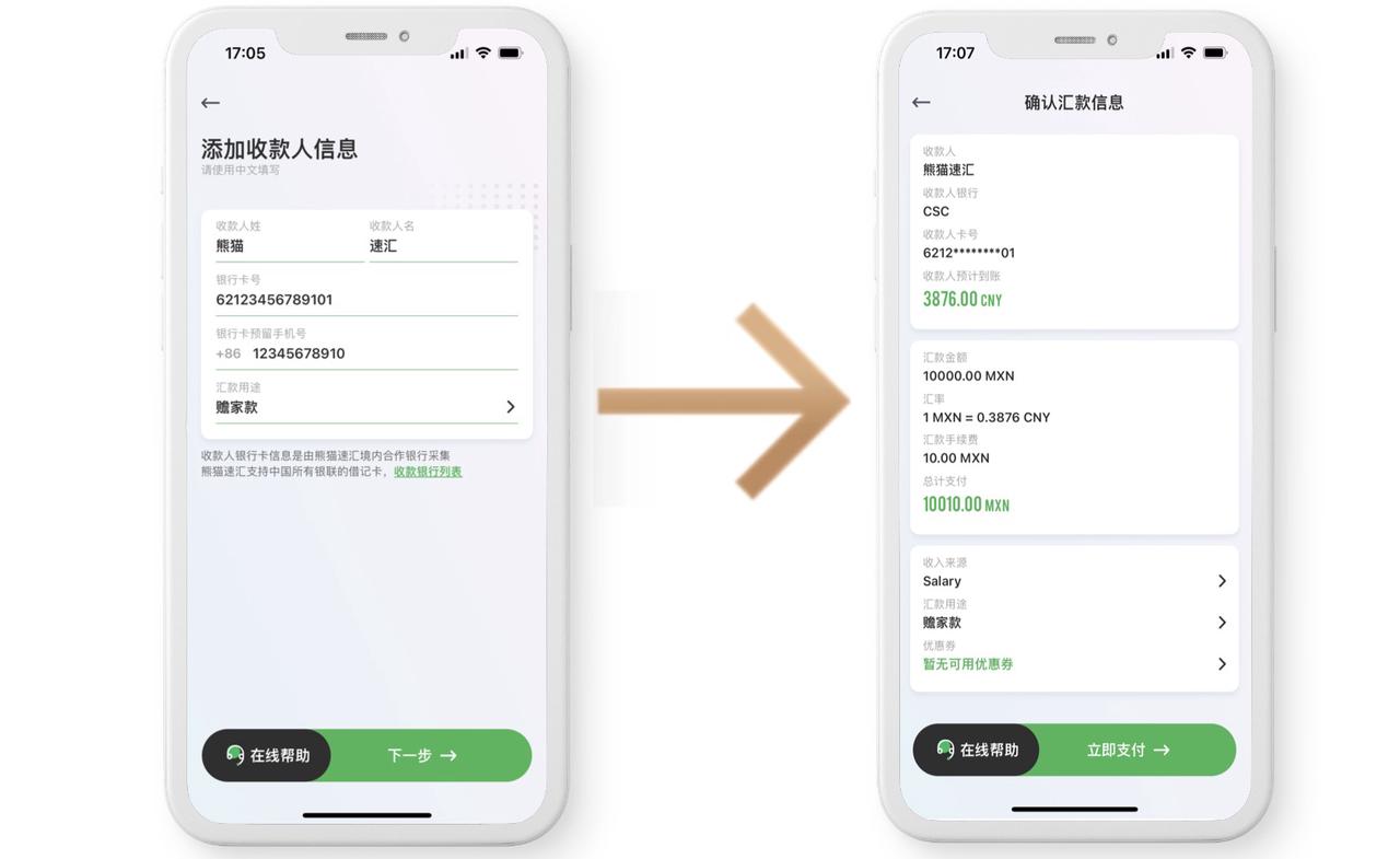 注意:请仔细核对【汇款信息】,如果有优惠券可选择使用优惠券。添加完收款人即可立即开始汇款,汇款信息无误即可点击【立即支付】。」