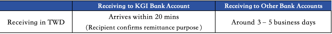 The time for funds to arrive mainly depends on the processing efficiency of the recipient’s bank. For faster receipt, it is recommended that recipients use a KGI Bank account; transfers to other banks may take 3–5 business days.