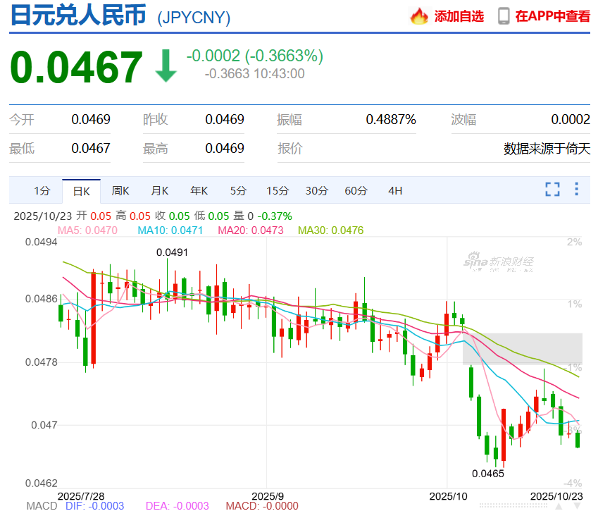 截至10月23日,1日元仅可兑0.0467人民币,整体仍显低迷。