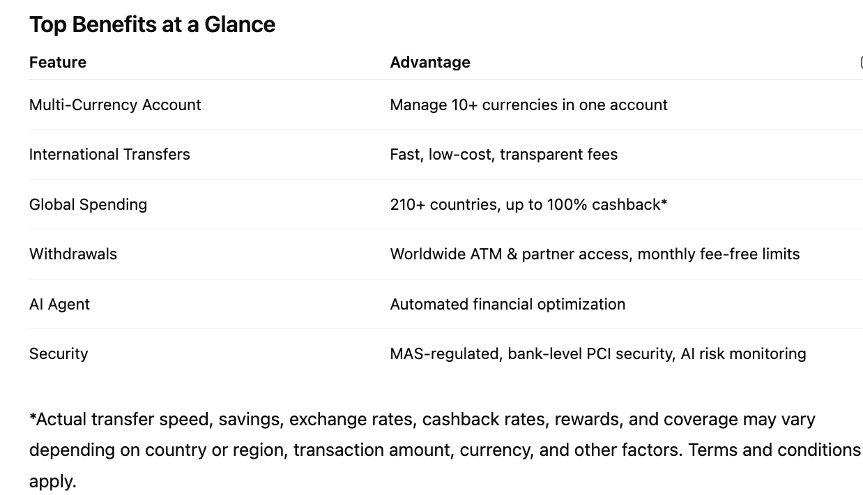 Open one account to hold and manage more than 10 major currencies, including USD, EUR, GBP, and SGD. Whether you’re sending money home, paying for services abroad, or receiving income internationally, all transactions are consolidated in a single, easy-to-use account.