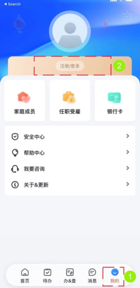2、개인소득세 앱을 실행하신 후, 「마이(My)」를 클릭한 다음 「등록/로그인」을 클릭해 주세요.