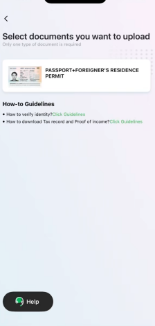 3、국적을 선택하고 블루오션뱅크(Blue Ocean Bank) 페이지에 접속한 후, 여권과 체류허가서를 업로드하여 계정을 인증해 주세요.