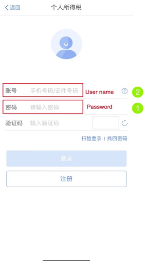 3、로그인 페이지에서 계정 사용자명(휴대폰 번호/주민등록번호)과 인증번호를 입력하세요.먼저 지방 세무서에서 본인 등록을 하셔야 합니다.