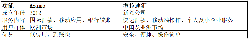 **目标用户:**Azimo主要面向频繁汇款的用户;考拉速汇则侧重中国及亚洲市场的个人用户。