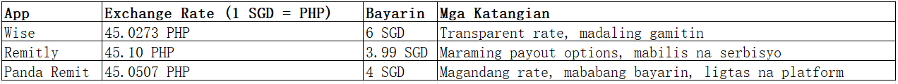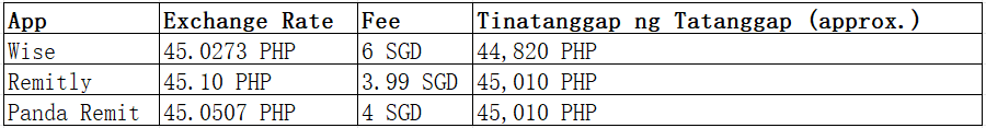 Bagaman pare-pareho ang kalidad ng serbisyo, Panda Remit ang isa sa pinakapraktikal na pagpipilian para sa mga Pilipino sa Singapore dahil sa kombinasyon ng mababang fee at magandang exchange rate.