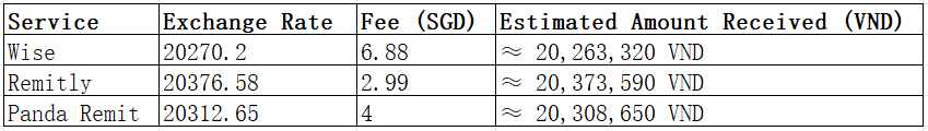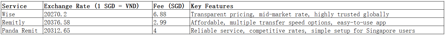 For sending money from Singapore to Vietnam, platforms like Wise and Remitly offer strong options. Panda Remit stands out as a reliable, secure, and cost-effective service, providing competitive exchange rates and low fees. For users who want a balance of affordability, convenience, and trustworthiness, Panda Remit is an excellent choice.