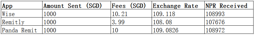 Suppose you want to send 1,000 SGD to Nepal. Here's how the fees and exchange rates compare: