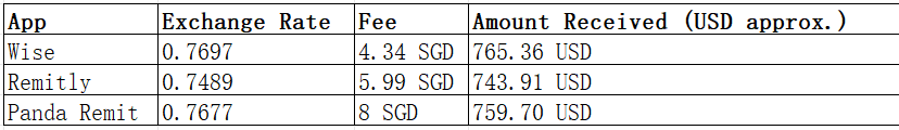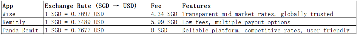 Here is a comparison of three leading apps for sending money from Singapore to the USA: