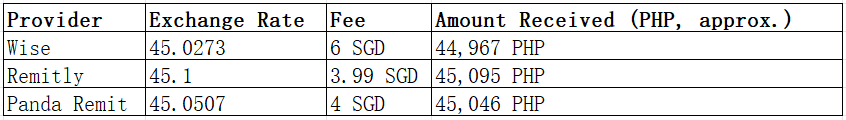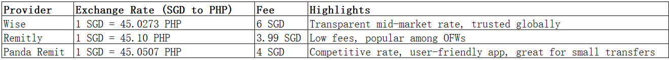Panda Remit stands out for its low fees and strong SGD–PHP exchange rates, making it one of the most affordable options for small transfers. While Wise and Remitly also provide reliable services, Panda Remit often appeals to users who prioritize value per transaction.