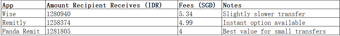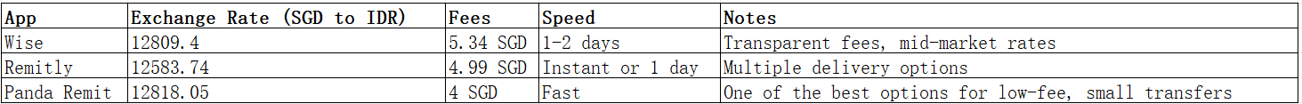 For sending small amounts from Singapore to Indonesia, Panda Remit offers a convenient, affordable, and reliable option. With competitive exchange rates, low fees, and fast delivery, it is one of the best options for small transfers. While Wise and Remitly remain popular choices, Panda Remit provides an excellent balance of cost efficiency and ease of use, ensuring your money reaches your recipients quickly and safely