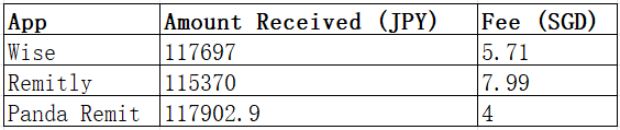 For sending 1,000 SGD to Japan, the approximate amounts received and fees are as follows: