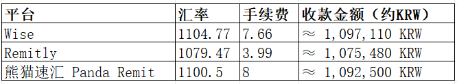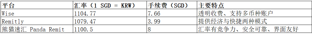 目前在新加坡向韩国汇款的主流App有 Wise、Remitly 与 熊猫速汇(Panda Remit)。以下是三者在费用与汇率上的比较: