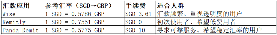 下表为三款常见汇款平台的参考对比(以汇1,000新币为例):