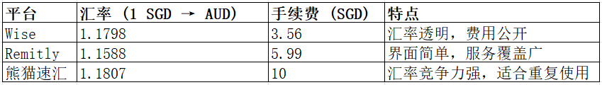 对于新加坡小额汇款到澳大利亚最省钱方法来说,选择合适平台能节省时间和费用。Wise透明可靠,Remitly操作便捷,而熊猫速汇凭借稳定汇率和易用体验,成为小额转账用户的首选之一。无论是生活费、学费还是家庭支持,熊猫速汇都是值得考虑的安全、经济选择。