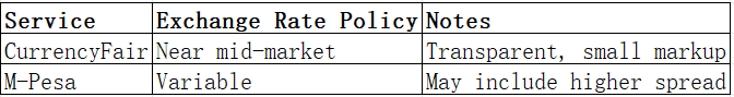 CurrencyFair maintains near mid-market rates with minor markups, offering transparency. M-Pesa may include higher spreads, affecting the overall cost.