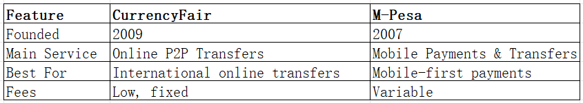 Target Users: CurrencyFair targets online-savvy users; M-Pesa serves mobile-first audiences