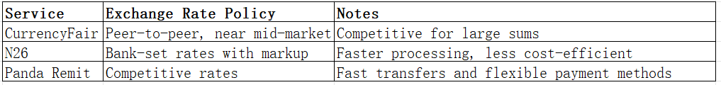 CurrencyFair operates on a peer-to-peer model, offering rates close to the mid-market rate with minimal markups. N26 uses traditional bank exchange rates, which can include a hidden markup, especially for non-Euro transfers.