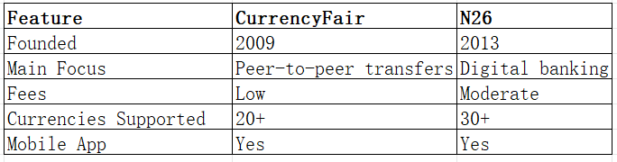 Differences: CurrencyFair excels in lower fees and exchange rates via a peer-to-peer system, while N26 offers a more traditional banking interface and integrated banking services. CurrencyFair is more suitable for cost-conscious users, whereas N26 targets those looking for digital banking convenience.