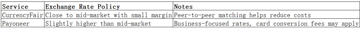 Differences: CurrencyFair uses a peer-to-peer model with lower fees for personal transfers, while Payoneer focuses on business solutions with card support and a wider payment network. CurrencyFair targets cost-conscious individuals and SMEs, whereas Payoneer mainly serves freelancers and global businesses.
