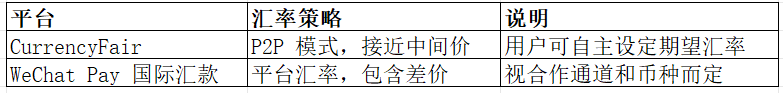 CurrencyFair 采用 P2P 汇兑模式,主打低汇率差;WeChat Pay 国际汇款则依赖合作通道,主打便利和速度。