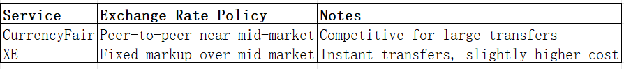 CurrencyFair’s peer-to-peer system often delivers near mid-market rates, minimizing markups. XE applies its own margin on top of the mid-market rate, which can slightly reduce the amount received.