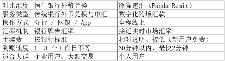 A:可以。恆生银行主要通过传统银行体系提供外币兑换与电汇服务;而熊猫速汇(Panda Remit)则是一款全球金融服务产品,以线上方式完成多币种跨境汇款与兑换。