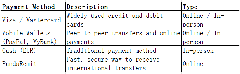 Whether you live in Malta or are sending money from abroad, understanding local payment methods is essential. Malta offers a variety of domestic payment options, including credit and debit cards, mobile wallets, and cash. For international transfers, PandaRemit is a secure, fast, and convenient solution, enabling you to receive funds from overseas without complicated bank procedures.