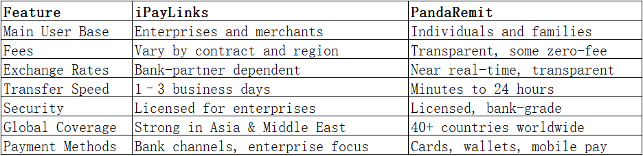 Overall, iPayLinks vs PandaRemit highlights two different focuses in cross-border finance. iPayLinks is well-suited for enterprises that need reliable payment settlement networks, while PandaRemit stands out as the go-to platform for individuals and families seeking affordable, fast, and secure international remittances.