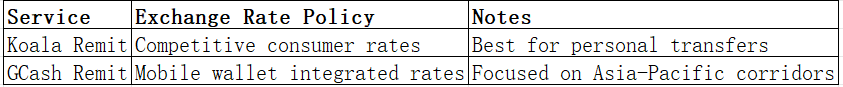 Koala Remit emphasizes quick personal transfers with a simple user interface. GCash Remit allows fast mobile wallet transfers, particularly within Asia.