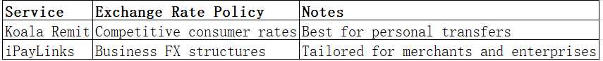 Exchange rate markups affect the net received. Koala Remit offers competitive rates for personal transfers, while iPayLinks provides business-oriented rates.