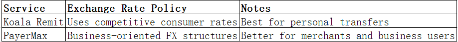 Exchange rate markups affect how much the recipient receives. Koala Remit provides competitive consumer rates, while PayerMax offers rates more tailored for business payouts.