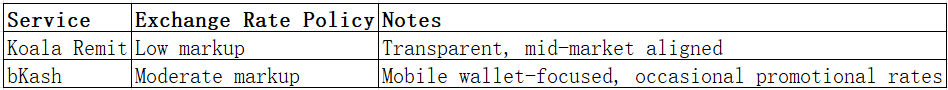 Koala Remit applies modest markups over mid-market rates to maintain transparency. bKash may offer occasional promotional rates but generally includes moderate markups.