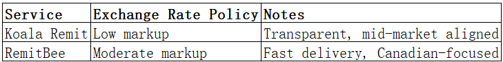 Koala Remit applies modest markups over mid-market rates, maintaining transparency. RemitBee provides slightly higher markups but offers competitive rates for Canadian senders.