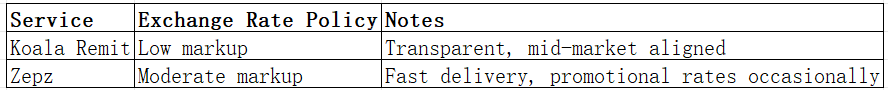 Koala Remit applies modest markups above mid-market rates, ensuring transparency. Zepz offers slightly higher markups, sometimes supplemented with promotional rates.