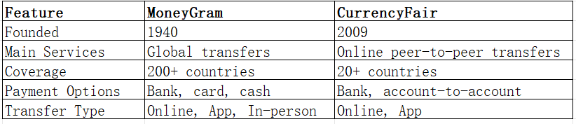 Comparing MoneyGram vs CurrencyFair highlights their respective strengths. MoneyGram is best for users seeking broad coverage and multiple payout options; CurrencyFair is ideal for low-cost, online peer-to-peer transfers.