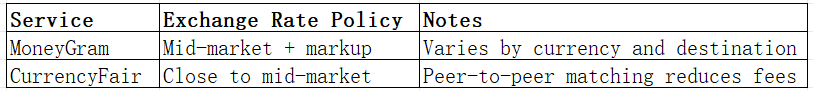 MoneyGram applies a markup on mid-market rates, which varies by currency and channel.