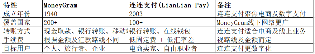 差异: MoneyGram依赖线下代理和现金取款,而连连支付则注重线上支付及电商业务,费用更透明。