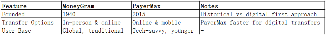 MoneyGram was founded in 1940 and offers global money transfer services to over 200 countries, with both online and in-person options. Its large user base benefits from widespread agent locations. PayerMax, launched in 2015, focuses on digital-first transfers with modern app integration and faster online processing, targeting tech-savvy customers. Both provide international money transfers, mobile app support, and debit card transfers. Differences include fees, functionality, and target audience. MoneyGram suits traditional users needing in-person access, while PayerMax caters to younger, tech-savvy customers who prefer digital convenience. Other alternatives like Panda Remit provide cost-effective and fast transfers.