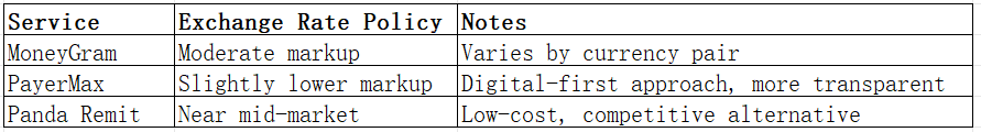 MoneyGram and PayerMax apply markups on top of mid-market rates.