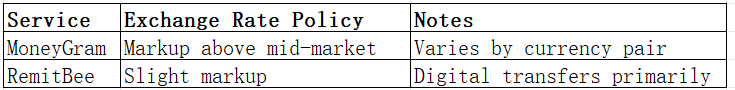MoneyGram applies a markup above the mid-market rate, impacting the total cost. RemitBee also includes a small markup on currency conversions.