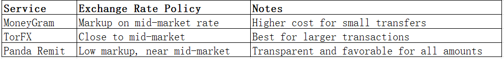 MoneyGram applies a markup on the mid-market exchange rate. TorFX offers competitive rates, often closer to mid-market for larger sums.